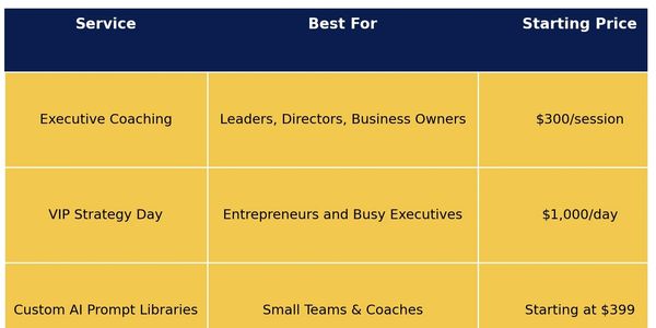 Whether you need executive coaching, a one-day VIP strategy session, or tailored AI prompts, we recommend what makes the most impact for your goals.